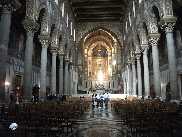 Monreale katedrálisát méltán a legszebb normann építészeti emléknek tartják Szicíliában. 1182-ben készült el. Állítólag a későbbi beavatkozások, átépítések az eredeti szépségét érintetlenül hagyták. Az építtető uralkodó, William II., egyik célja volt, hogy még szebbet és nagyobbat alkosson, mint a nagyapja Roger II. által épített Palatine kápolna Palermóban a Királyi Palotában. A templomba lépve (ingyenes) a látvány tényleg lélegzetelállító, ahogy körbenézünk és meglátjuk az óriási Jézus mozaikot. Ugyancsak világhíres a katedrális melletti kerengő (chiostro, belépő: 6 €), melyet 216 csodálatosan faragott, hihetetlenül gazdagon díszített oszlop szegélyez, melyek mind különbözőek.