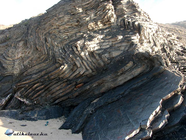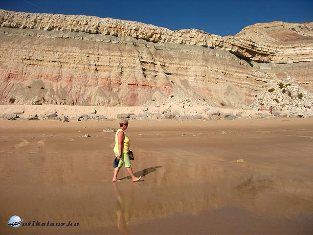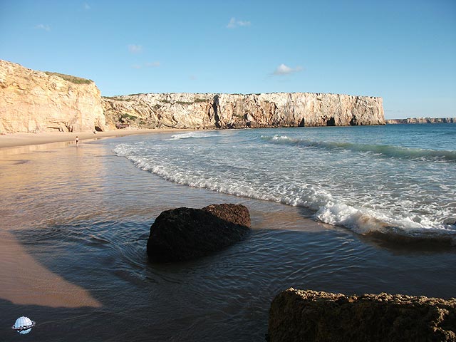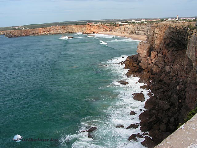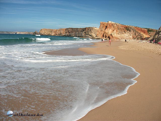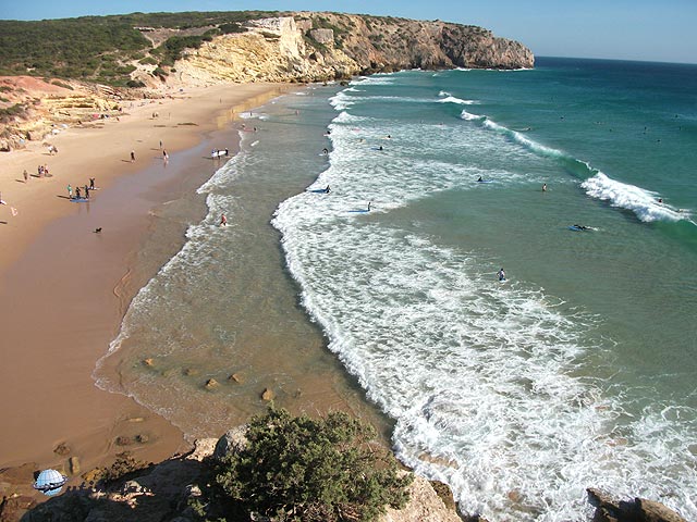 Gyorsan irányt váltottunk a nagyon furcsa alakú Sagres félsziget másik oldala felé, ahol az út a híres sagresi erőd, a Fortaleza felé visz. Az erőd miatt erre is jártunk már régebben és persze, hogy kihagytuk a Praia doTonel meglátogatását. Az útról nem lehet látni semmit, azt az utat sem, ami félig levisz a strandhoz, melynek hasonlóan szép a fekvése, mint az innen kb. 1 km-re levő Belixének. Az erőd felé eső végén találtunk egy óriási árnyékot adó sziklát, így itt táboroztunk le. Annak ellenére, hogy a strand nyugati irányba néz, nem voltak ijesztő méretű hullámok, így hosszas előkészület után bemerészkedtem a vízbe. Korábban nem gondoltam volna, hogy itt fürdeni fogok. Nagyon csábító volt. A kétszeri kijövetel így is izgalmasan alakult, küzdeni kellett, hogy el ne essek az erős sodrásban, mert az “végzetes” lehet, mivel a fekvő ember könnyen a sorozatban érkező hullámok játékszerévé válhat. (Fürdés itt csak rutinosaknak ajánlható!) A kijövetelhez érdemes várni arra az időszakra, amikor az óceán látszólag megnyugszik. Ez olyan mintha egy-két hullámhegy kimaradna a folyamatosan partra-futó hullámhegyek sorozatában. Ilyenkor nagyon gyorsan kell úszni a part felé és mielőbb talajt kell fogni és kifutni, hogy a visszaáramló víztömeg vissza ne tudjon sodorni.