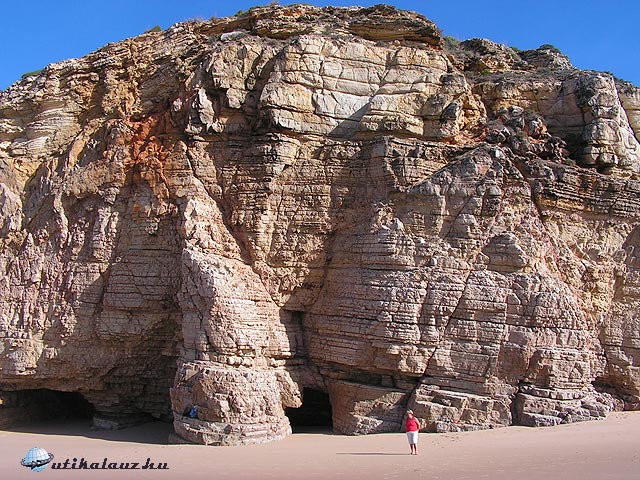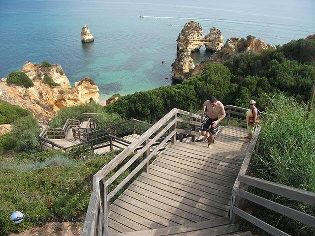 Így aztán az idén úgy terveztük, hogy Lagosnál keletebbre nem megyünk, ami már így is kb. 10 km-rel kilóg a tájvédelem alá eső területből. Ez a partszakasz (Ponta da Piedade) rendkívül vadregényes, színes, szabdalt, telis tele van apró öblökkel, toronyként a tengerből kiemelkedő kis szigetekkel, barlangokkal, stb. S ami hab a tortán az a parti képződmények élénk színvilága a tenger nyújtotta kék háttér előtt. A növényzet a zöld, a homokkősziklák pedig a sárga és vörös közti színátmenet minden árnyalatával jellemezhetők. Szerintünk ez itt Európa egyik legszebb tengerparti szakasza.