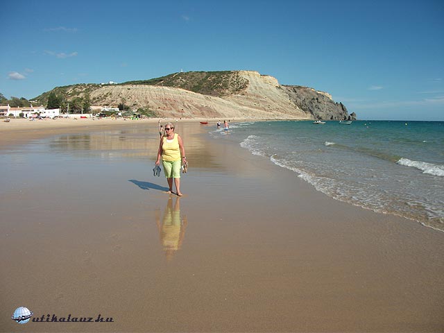 Útban hazafelé megnéztük a Praia Porto de Mos strandot. Az óriási homokos nyílt part nem nyerte el tetszésünket. Az ilyen strandokon nehéz természetes árnyékot találni, leégni pedig nem akartunk. Továbbra is partközelben maradva Praia da Luz következett. Az óriási öböl bejárása több, mint egy órába telt, volt miben gyönyörködni. Kiválóan alkalmas szerintünk tengerparti ejtőzésre (nagyon szép sziklaképződmények láthatók), de árnyékos helyek hiányában strandolást ide sem terveztünk.