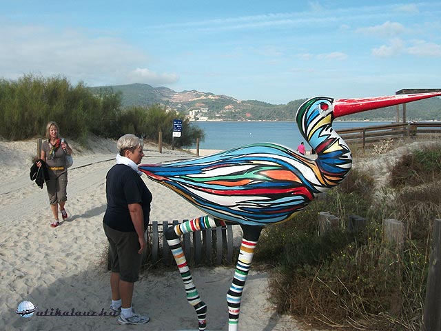 Setúbálból dél felé, az autópályát elkerülve, két utat is próbáltunk, mindkettő érdekes. Tavaly a rövidebbet választottuk, így a Sadon komppal keltünk át a Tróia félszigetre. A partot elérve jobbra fordultunk, a már kissé lepukkant Tróia Resort felé és a félsziget végéről a part mentén tettünk egy sétát a deszka-sétányon a végtelennek tűnő homokos parton.