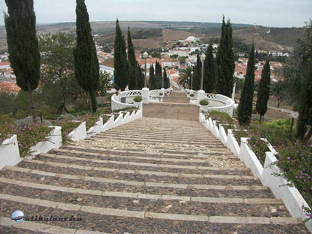 Másnap reggel úgy döntöttünk, hogy tovább folytatjuk felfedező utunkat Alentejo tartomány közepén. Csodálatos itt autózni, nagy a nyugalom. Forgalom alig van. A táj számunkra egzotikus és eléggé rendezett, úgy rendben van minden, pedig a terület időjárása ugyancsak szélsőséges. Állítólag ez itt Európa egyik legforróbb és legszárazabb része. Nincsenek elhanyagolt területek az óriási oliva, paratölgy és egyéb ültetvények között. Így jutottunk Aljustrelbe, ahol a városnéző séta közben éreztük, hogy ritka látvány vagyunk, egy turisták által biztos aligha látogatott településen itt a “semmi közepén”. Itt történt, hogy egyikünk napszemüvege használhatatlanná vált. Az elveszett csavart ingyenesen és mosolyogva pótolta a kisváros optikusa. A sikeres akció után jól esett egy kis hegymászás a település szépen rendezett kálvária dombján.