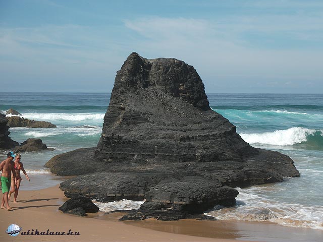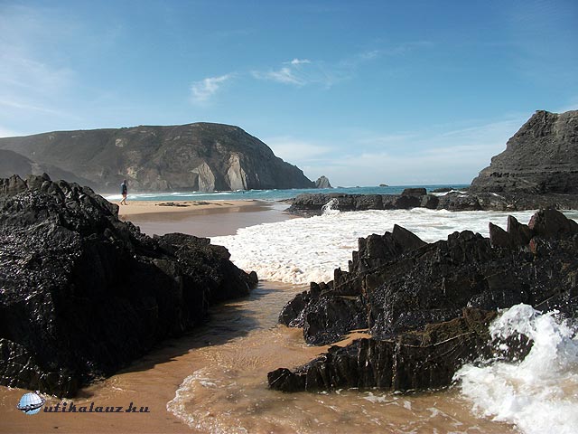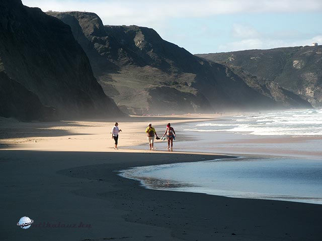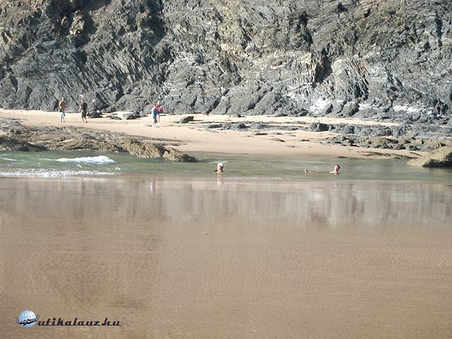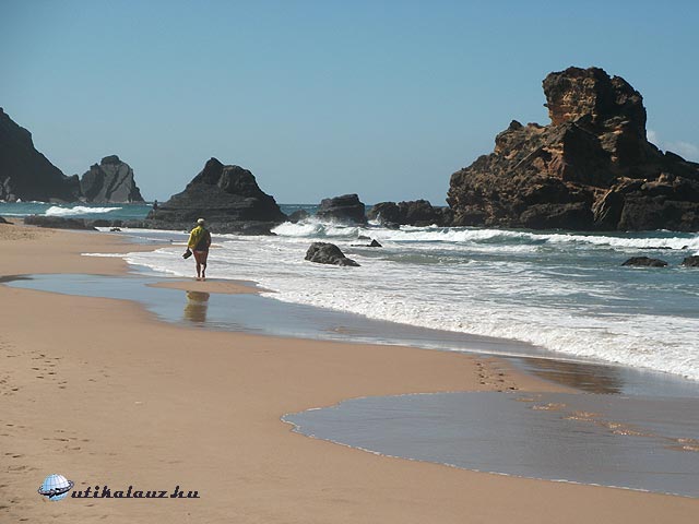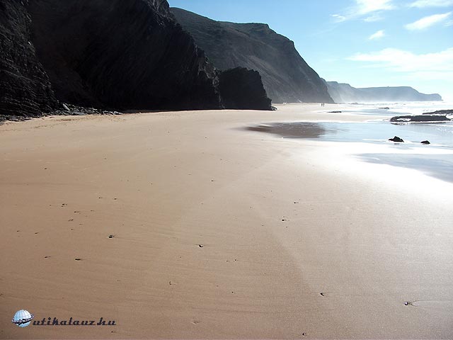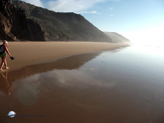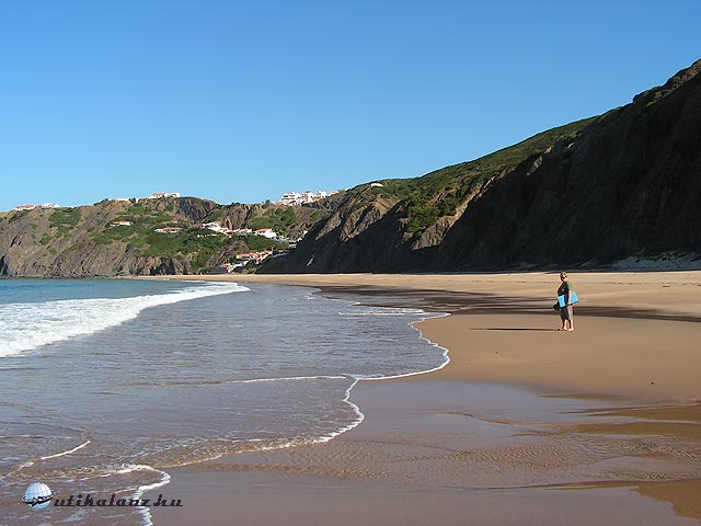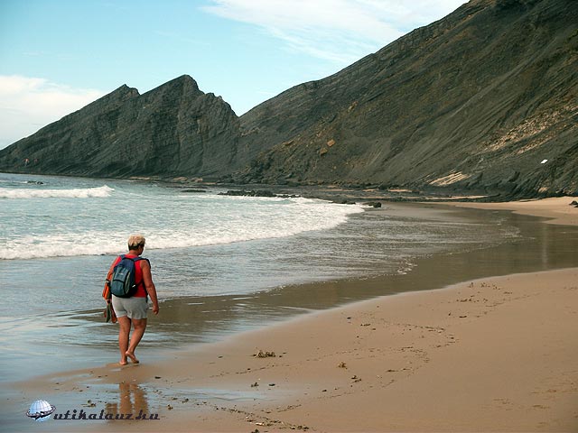 A nap folyamán a szörfösökön kívül alig pár emberrel találkoztunk. Élveztük a tömény sós levegőt a nagy hullámzás következtében keletkező és a part felé áramló ködfelhőkből. E jelenség kicsit enyhíti a széles homokos part aranysárga színe és a part másik oldalán futó 100-150 m magas fekete sziklafal kontrasztját. Aznap szerencsénk volt, épp apály volt, így déli irányban gyalogolva könnyen átsétálhattunk a Praia Castelejora, vagy a másik irányban a Barrigara. Fürdeni nem mertünk, de azért szinte állandóan vízben voltunk, maximum térdmagasságig engedve az alattunk oda-vissza járó és szétterülő hullámokat.