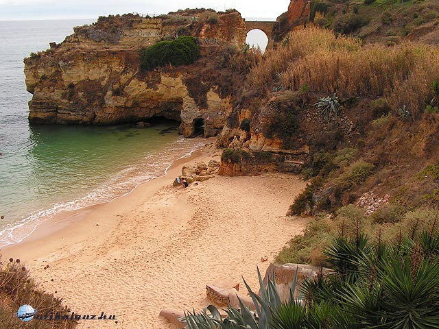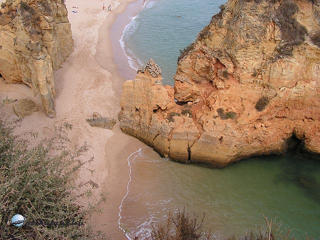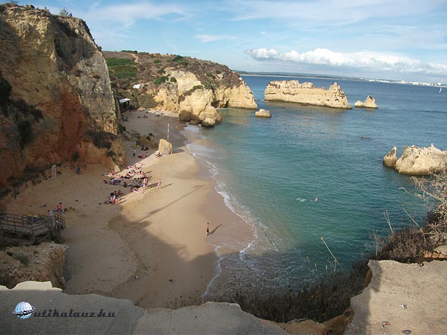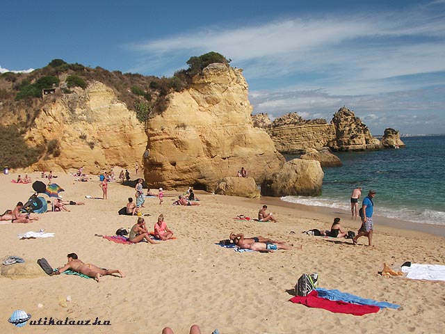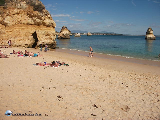 Sagresből, kényelmesen kb. egy óra alatt értük el Lagos egyre dagadó lakópark övezetét. Az N125-ös főútról a centrum irányába letérve egymást érik a körforgalmak, melyekből a kivezető útirányok jól kitáblázottak. Így választottuk találomra a Praia D’Anat. Nagyon tetszett, de gondoltuk azért nézzünk meg még egyet, a közeli Praia do Camilot. A különbséget nehéz lenne megfogalmazni, a lényeg, hogy idilli volt ez is, és nagyon alkalmas strandolásra. Különösen kedvező volt, hogy az ilyen sziklás strandokon könnyű mindig árnyékot is találni a tűző októberi nap elől.