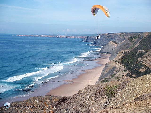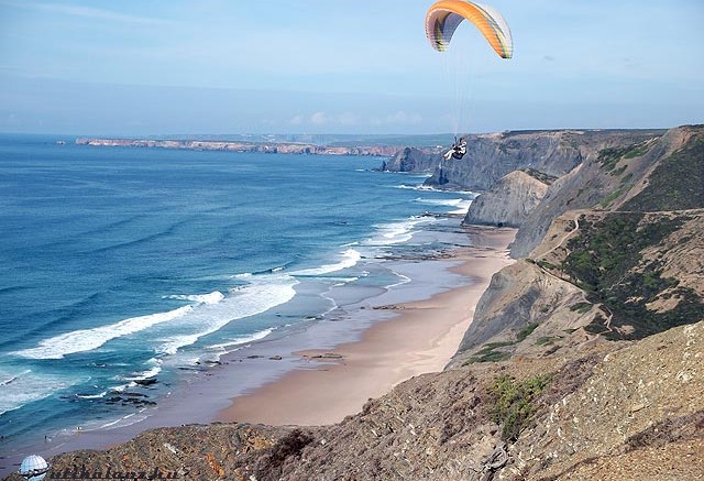 Útban hazafelé következett a hab az aznapi tortán, a Miradouró = Kilátó, mely szót ugyancsak érdemes megtanulni. Már csak a siklóernyősök kedvéért is fel akartunk menni arra a kb. 150 m-es sziklafalra, melyről tényleg lélegzetelállító kilátás nyílik a ma bejárt strandok egy részére és közelről nézhető, ahogy a siklóernyősök elrugaszkodnak a mélység fölé. A legjobb kilátásért a közelben található Terre de Aspa kilátóhelyet kellett volna felkeresni, de, vigyázva a bérelt kocsira, nem vállaltuk az odavezető földúton az autózást.