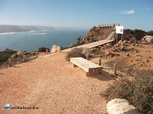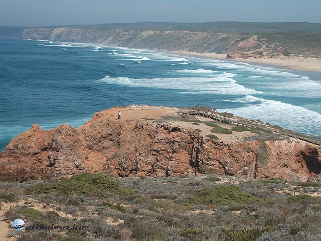 Praia do Amado a nyugati part egyik híres szörföző helye, egész évben működik. Hogy elérjük, kb. 25 km-t mentünk kényelmesen Sagresből a 268-as úton, élvezve a nemzeti park egyetlen, gyér forgalmú útját, melyet eukaliptusz és fenyőfasor szegélyez, és hallgatva a legjobb portugál zenei adót. Kihasználva a fátyolos felhőzet adta napvédelmet, először a sziklás, magas-parton sétáltunk egyet az autók által is használt köves úton, melyen észak felé haladva el lehet menni egészen a következő óriási strandig, a Bordeiráig. Közben,100-200 méterenként, az évről évre szaporodó, szépen kiépített deszkasétányokon érdemes kimenni a látványos helyekhez (Hála az erre a célra okosan felhasznált uniós támogatásoknak!). Több sétány végén már pad és asztal is van. Nem akármilyen környezetben lehet itt piknikezni. Itt minden együtt van a természet csodálatához, s ha csak a sziklák, sziklarétegek színskáláját és formáját vesszük, hihetetlen változatosságot találunk. Unatkozni egy pillanatra sem lehet, senki sem zavar, szinte csak szörfösök járnak ide. Ezt a kirándulást autóval is meg lehet tenni, de nem érdemes így elindulni, mert oly sok helyen kellene megállni, s kisétálni a kiépített kilátókhoz. A látvány festői, így csak elég lassan lehet előrehaladni.