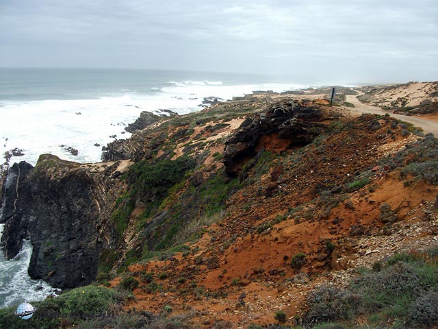 A legfontosabb mégis annak az útnak a megtalálása, mely a három, apálykor egybefüggő praia: a Cordoama, Castelejo és Barriga irányába vezet ki a településről, érdekes módon egy tartós hegymenettel. Ez mindjárt érhetővé válik, ha arra gondolunk, hogy a Costa Vicentina legmagasabb partszakasza éppen e strandok mellett/felett húzódik. Egy útelágazásnál először a Cordoama irányt választottuk, hogy aztán egészen a homokos partig aszfaltos úton mehessünk. Az út végén egy étterem parkolóval, ennyi, aztán a csodás természet, ami itt kiválóan alkalmas akár egy egész napos nézelődésre, tapicskálva a legfinomabb keményre döngölt homokon.