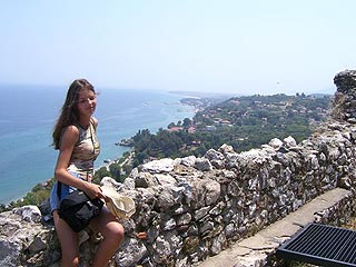 Olympos 28 km-re van. Csodálatos kilátás, de fele a ködbe vész. Útba esik Platamonas vára, ahol érdemes kiállni a várfokra. Száj tátva marad a panorámától. Beugró 4 E, de diákigazolvánnyal diákoknak ingyenes. Nebuló ne induljon a világnak nemzetközi diákigazolvány nélkül. A két gyermekünk két igazolványával kb. 60 E spóroltunk meg. Felmutatásával sehol sem kellett belépőt venniük. Próbálkoztam étteremben is vele, de nem jött össze. 🙂
