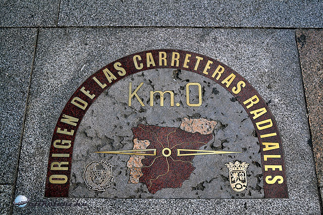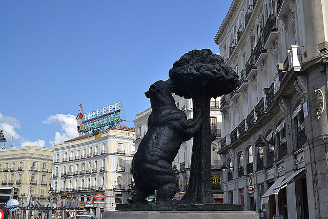 Majd’ minden reggeli kiindulópontunk a szállodánktól pár percnyi gyalogútra levő Puerta de Sol volt. Madrid majdnem pontosan Spanyolország mértani középpontjában fekszik, ez a tér pedig Madrid közepe, így aztán nem meglepő, hogy itt található a 0 km-kő, amely nem is annyira kő, mint inkább egy járdalap a Casa de Correos nevű palota előtt. Az ovális alakú tér közepén áll III. Károly impozáns lovas szobra, amit azonban háttérbe szorít a tér szélén lévő “turisták kedvence”, az “El oso y el madrono”, amely nem más, mint a város címerében is látható medve, amint éppen az eperfát dézsmálja.