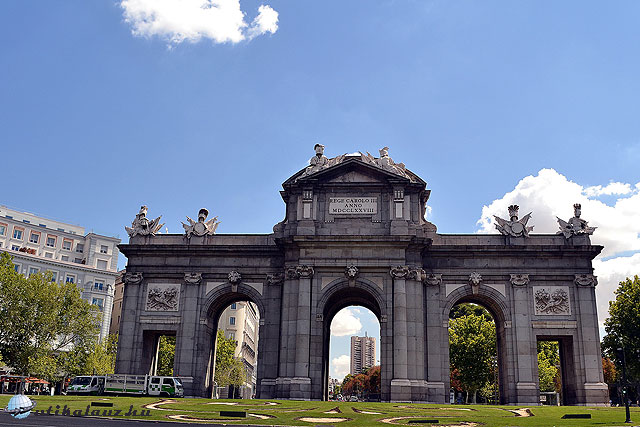 Egyenesen továbbhaladva utunk aznapi végcéljához, a Prado-hoz értünk volna, de előtte beiktattunk egy jó nagy kerülőt és balra fordulva, a Calle Alcala-n az Alcala kapuhoz (Puerta de Alcala) jutottunk. A kaput a híres olasz építész, Sabatini tervezte, 1778-ban avatták fel és eredetileg Madrid keleti határában, mint működő, ajtóval ellátott városkapu funkcionált, jelenlegi helyére csak a 19. században került.