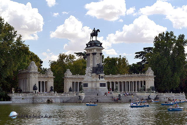 A tér és a kapu a város egyik legszebb parkjának a Parque del Buen Retiro-nak az egyik sarkában található, kézenfekvő volt, hogy utunkat a parkban folytassuk, annál is inkább, mert ott is remek látványosságok vártak ránk. Az egykori királyi terület csak a 19. század vége felé nyílt meg a nagyközönség számára, korábban csak az arisztokrácia látogathatta. A park legrégebbi létesítménye az Estanque del Retiro nevű csónakázótó, amelyen IV. Fülöp idejében tengeri csatajeleneteket játszottak el az úri közönség szórakoztatására, jelenleg pedig bérelt csónakokkal lehet a vizet járni.