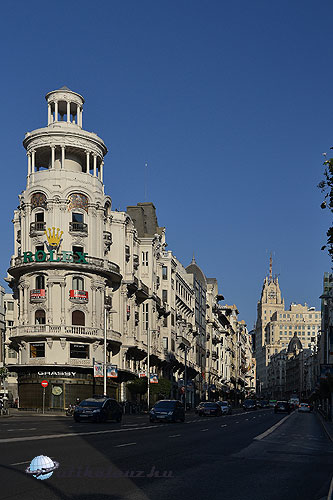 A város egyik fő nevezetessége, a Gran Via szó szerint a lábunk előtt hevert, hiszen ott laktunk. Úgy tartják, hogy ez nem csak Madrid, de egész Spanyolország legismertebb utcája, ami bővelkedik a lenyűgöző építészeti alkotásokban. Talán leghíresebb épülete az 1911-ben felavatott Metropolis, amelynek tornyát 24 karátos arany díszíti, és amelyből “természetesen” nem sokat láttunk, mert éppen felújítás alatt volt (van), így aztán többek között az Edificio Grassy-val és a 89 méter magas, első európai felhőkarcolóként épült Telefonica épületével vigasztalódtunk, amely utóbbira szállodaszobánk ablakából is jó kilátás nyílt.