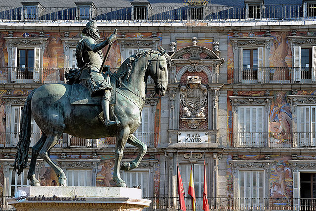III. Fülöp, mögötte a freskókkal díszített Casa de la Panadería a Plaza Mayor-on