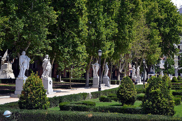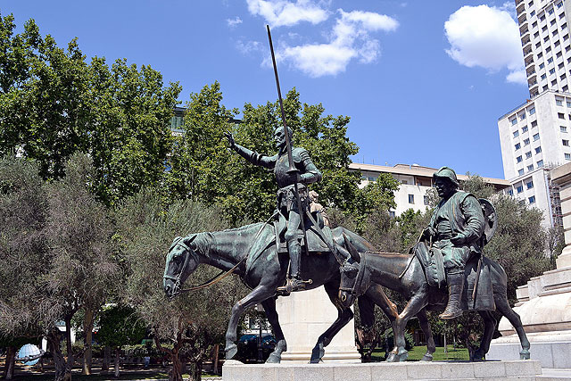 A palotát elhagyva, annak keleti felénél érintettük a Plaza de Oriente nevű teret (Nomen est omen), ahol a Királyi Színház (Teatro Real) is található, majd rövid séta után a Plaza de Espana-ra jutottunk. A tér közepén hű fegyverhordozója, Sancho Panza társaságában ott lovagol Rosinante nevű lován az elmés lovag Don Quijote de la Mancha, fölöttük pedig ott magasodik az író, Miguel de Cervantes Saavedra emlékműve.