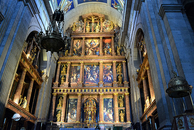 A görög kereszt alaprajzú templomnak 95 méter magas kupolája és értékes képekkel díszített 45 oltára van, a boltozatot pedig Luca Giordano-tól származó freskók borítják. A főhajó alatt található a vörös márványból kirakott királyok pantheonja, ahol 26 spanyol király és királyné földi maradványait őrzik, többek között V. Károly, és a jelenlegi király VI. Fülöp nagyszülei is itt nyugszanak. Innen nyílik az infánsok pantheonja, ahol a királyi gyermekek és a gyermektelen királynék szarkofágjai találhatók, de itt őrzik pl. Don Juan de Austria, a lepantói győző kőkoporsóját is.