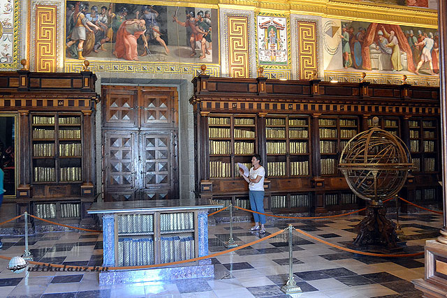 A sok értékes, ókori klasszikai és arab irodalmi kincseket magában rejtő könyvtárat II. Fülöp híres építésze, Herrera tervezte és az első olyan könyvtár volt, ahol a korábbi pulton való elhelyezés helyett fali polcokon oldották meg a könyvek tárolását.