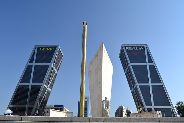 Utolsó napunkat szokásunktól eltérően nem a Sol-on kezdtük, a szállodánktól pár lépésre levő Gran Via állomásról egy 3-as 10-es vonalkombinációval a Plaza de Castilla-ig metróztunk, hogy megnézzük Európa kapuját. A Puerta de Europa nem más, mint két 114 méter magas, 15 fokos dőlésszögű toronyház, amelyek valóban egy óriási kapu két oszlopának tűnnek, ahogy egymás felé “hajolnak”. Az 1989-től 1996-ig épült ikertornyokat, amelyek egyébként irodaházként működnek, két amerikai építész, Philip Johnson és John Burgee tervezte és ezek a világ első ferde felhőkarcolói.