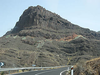 Ismét a hegyvidéké a nap. De ez eredeti programterv szerint túraútvonalat menet közben módosítani kellett, mert rájöttünk, hogy a távolságokat nem kilométerben, hanem időtávban kellene számolni, mert a kettes (sőt néhol egyes!) sebesség egy kis motorfékkel kombinálva nem igazán hatékony módja a gyors előre (vagy inkább fel és le)jutásnak. Artenara volt az első úticélunk a barlangkápolnával. Puerto de Mogan és Mogan felé elindulva, majd Mogannál letérve San Nicolas de Tolentino irányába az első hágót leküzdve az Azulejos nevű természeti képződmény tűnik fel. Bár a hegyoldalakon való szerpentines úton eltartott egy ideig míg odaértünk, Szerencsére végig látszódik az azúr és terrakotta színekben pompázó sziklafal.