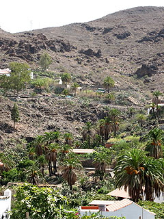 Elindultunk befelé a sziget belseje felé vezető legközelebbi (GC60) úton, hogy felfedezzük a környéket. Első állomásunk egy, az őslakosok életét bemutató kiállítás lett volna (kb. 6 km-re), de nem nagyon fűlt hozzá a fogunk, mivel ekkora már tikkasztó nagy meleg lett (persze ez csak fokozódott a nap folyamán), így továbbindultunk csak felfelé., s ahogy haladtunk előre, a táj is lassan kezdett megváltozni. A kopár és vöröses tájat kezdetben kaktuszok, később pálmafák, sőt citromligetek kezdték tarkítani. Fataga, egy csendes, árnyat adó(!) fákkal benőtt völgy mélyén lévő kicsiny falu, mely a déli szieszta alatti álmát aludta. (A névre kattintva – ahogy a továbbiakban is – másik ablakba be lehet hívni a Google térképének megfelelő pontját. A “-” ikonra kattintva bővítheted a megjelenő területet – a szerk.)