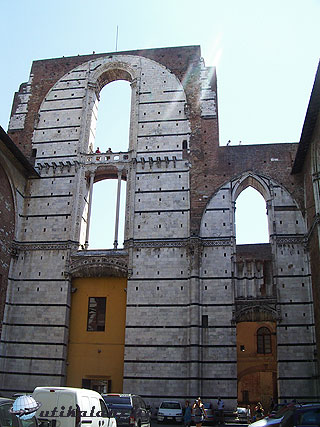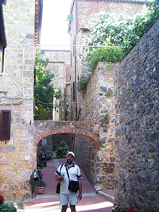 A városka Gimignano püspökről kapta a nevét, aki a hun támadások idején, a helybéli lakosságból megszervezte a település védelmét. A középkor “Manhattan-je” nevet a város azért kapta az utókortól, mert a városban közel 70 db, kb. 30 méter magas tornyot emeltek a helybéliek. Mindegyik tornyot egy-egy család birtokolta, ezekben is laktak. Állítólag, a családok huzamos ideig háborúskodtak egymással, ezért védelmi célból építették a tornyokat. Mások szerint státusszimbólumok voltak, megint mások úgy tartják, hogy posztótárolásra szolgáltak, mivel a helybéliek nagyrészt posztókereskedéssel foglalkoznak. Mára csak néhány darab maradt közülük, de így is lenyűgözőek! Amikor beértünk a főtérre, annak méreteihez képest sok, (vagy több) száz turista fogadott ott bennünket. Jókedvűen, a lépcsőkön és a tér kövezetén üldögélve nyalták fagyijukat, itták sörüket, vagy kólájukat. Látszott rajtuk egyfajta nyugalom, ahogy átszellemülten szívják magukba a középkor hangulatát, az ódon falak és tornyok varázsát.