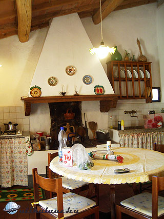 A “mi házunk” mindjárt az első volt jobbról az összesen 6-7 épületet számláló faluban. A neten lévő képe alapján felismertük ugyan, de meglepett bennünket, hogy – a látottak alapján – egy magányosan álló épületre számítottunk, ezzel szemben vele szemben az út túloldalán egy néhány éves kb. ötven méter hosszú sorház állt, amiben 15-20 üdülőrész volt, rendezett környezettel, parkolóval, közvilágítással.