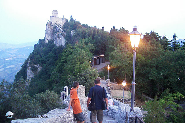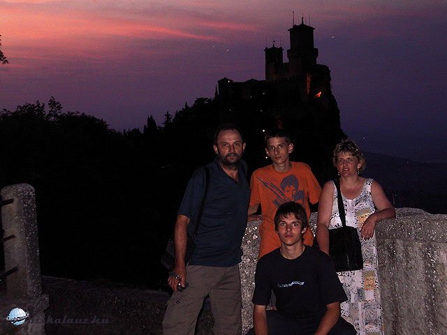 A San Marinóig megtett 159 km eléggé mozgalmas volt. 19 óra 30-kor értünk oda. Megkerestük a Via Gino Giacomini-n a parkolóházat (Török Péter ajánlotta), de az utcában sok volt a szabad hely, így egy kicsit tovább gurultunk. Mivel nem volt sem fizetős, sem tilos a várakozás, leparkoltunk az utcán. Persze, hogy volt hely, az épeszű turisták ilyenkor már maguk mögött hagyták ezt a helyet. Nem baj, nem kellett sehol sem tolakodnunk. Kétszeri liftezéssel felmentünk a várba. Az első liftből kiszállva kicsit megijedtünk, mert a közelben lévő boltok kirakatit Cirill betűs feliratok díszítették. (“Az oroszok már a spájzban vannak?”)