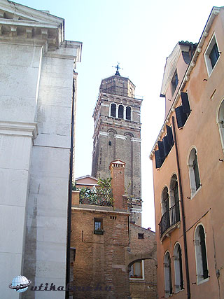 A Szent Márk térről a parton egy darabig nyugati irányban ballagtunk, majd északnak, vissza a parkolóház felé. Közben sok apró csatornán keltünk át, és a város eldugottabb zugait is láttuk. Találtunk egy érdekes tornyot is, ami a pisaihoz hasonlóan dől. (Bár nem olyan nagymértékben, viszont ez gyakorlatilag vízben áll!)