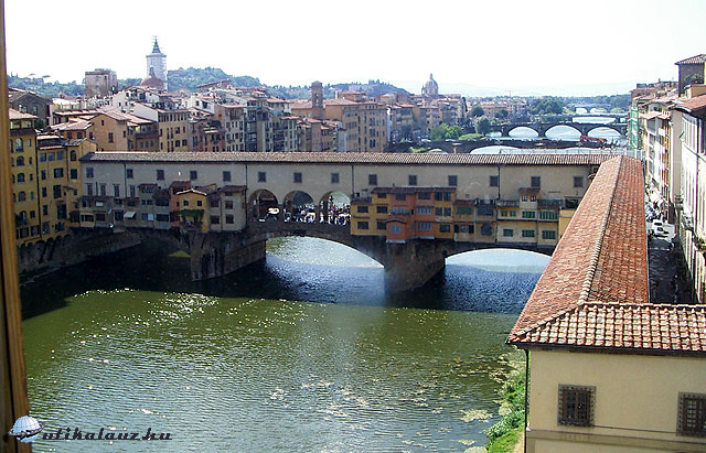 A Ponte Vecchio-hídról én nem írnék, a korábbi beszámolókat csak ismételni tudnám. Gyönyörű, öreg és szűk. Főleg a kövezeten hemzsegő alkalmi árusok portékáitól. ( Én is vettem itt egy kicsi teleszkópos lábú kameraállványt. 10 euróról csupán 4-re alkudtam le, mert siettünk.) Úgy gondoltuk, először megnézzük az Uffizit. Bár vasárnap van, azért lehet szerencsénk is a sorban állással! Hát nem lett. Sor az volt, úgy 60-70 m hosszú, viszont árnyék volt végig. Kriszta úgy gondolta megpróbálja, aztán, ha lassan halad legfeljebb odébbállunk. Lesz még látnivalónk, hiszen még csak most kezdjük az ismerkedést a várossal. (Miközben Kriszta és Ádám sorban állt, addig próbáltuk megtalálni a Török Péter által javasolt jegyirodát a Via dei Calsainolin. Józsival végigjártuk az utcát egészen a Dómig és vissza, de sajnos nem találtunk rá.) Rátaláltunk viszont egy régi ismerősre. Bár csak másolatban, de Michelangelo Dávidja nézett le ránk a Piázza della Signorián, valamint Cosimo di Medici lovas szobra uralta a teret. Majd 3 óra álldogálás után bejutottunk a múzeumba. (Ez idő alatt Józsi még visszaszaladt a Pitti Palotával szemben lévő internet kávézóba egyéb szociális szoftveres problémáit orvosolni.)