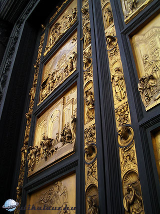 . Pihenésképp kimentünk a képtár presszójának teraszára. (Mint később kiderült, ez a Loggia dei Lanzi tetején volt a Piázza della Signorián a Palazzo Vecchio tőszomszédságában.) Akármilyenek is voltak a Mediciek, az biztos, hogy a művészetekhez értettek, és nem sajnálták rá a pénzüket. Majdnem záráskor jöttünk ki. Én agyilag teljesen zokni voltam már ekkor. A kijáratnál az utca túloldalán vettünk három kisadag fagyit (3 euró/adag). Én fragola-t = eper kértem, csak ajánlani tudom, nagyon finom volt. Elindultunk a főtér, majd onnan a Dóm felé. Ekkor már este 7 után voltunk, de a turisták hömpölygő áradatán ez nem igazán látszott. Látszott viszont az utcát és a tereket szépen elöntő szemét! (Néhány órával korábban már Józsival egyszer jártunk erre, akkor még sokkal kevesebb hulladék hevert a földön.) A Dóm előtt még kitartóan várakoztak a belépni akarók. Mi a Keresztelő kápolna Paradicsomi kapuját nézegettük (sajnos a védőrácsoktól nagyon nehéz volt fényképezni), amikor feloszlott a sor, mert bezárták a templomot.