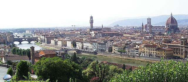 Reggeli után, fél tíz körül elindultunk Firenzébe. Eredetileg ezt a napot a közvetlen környékünkön akartuk eltölteni pihenéssel. Mivel frissnek éreztük magunkat és tudtuk, hogy másnap hétfőn sok látnivaló zárva lesz, hát Firenzét választottuk. Könnyedén visszataláltunk a Firenze – Siena autóútra, majd két órán belül, (11 óra 50-kor) az egyik általunk otthon kiválasztott parkolóban voltunk. A parkoló bejáratát könnyű elhibázni. Az Arnó innenső oldalán a Római kapunál (Porta Romana) lévő körforgalomból egyenesen nyílik. Ez egy szabadtéri parkoló a külső városfal belső oldalán (1,5 euróért/ óra,). Viszonylag mindig árnyékos, sűrűn telepített kamerákkal, fizetés után sorompó enged ki.