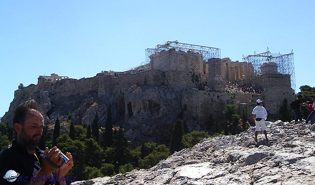 Az Akropoliszhoz képest északra voltunk ekkor. Innen negyedórai kényelmes séta után, már 9 óra körül az Akropolisz bejáratánál voltunk. Szinte hemzsegtek itt a különféle egzotikus tájakról származó, sokszor erőszakos illegális mozgó árusok. Hideg ásványvizet, dobozos sört, bambuszból készült napernyőket akartak ránk tukmálni. Amikor megjelent egy rendőrautó, pillanatok alatt eltűntek az olajfák közt, majd a veszély elmúltával ismét előjöttek, és folytatták a turisták zaklatását.