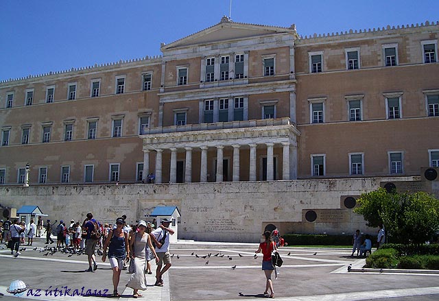 Az Akropoliszról lejöttünk, majd mi hárman a fiúkkal a tőszomszédságában lévő Areioszpagosz dombra is felkapaszkodtunk. Ugyan mi nem követtük Szent Pál példáját, aki i.sz. 51-ben elég nagy bátorságot téve, a város római vezetőinek szeme láttára innen hirdette Krisztus tanait. A magaslat nem volt túl magas (15-20 m), és meredek sem, viszont borzasztóan csúsztak a kövek az oldalán és a tetején is. A néhány száz négyzetméteres tetőről szép volt a kilátás az előttünk lent elterülő Római Agórára és a hátunk mögött magasodó Akropoliszra. Amikor lekászálódtunk a szikláról, éppen egy nagyobb rendőri razzia szemtanúi lehettünk, akciófilmbeli gyorsasággal fogtak el, bilincseltek meg és vittel el a rendőrök kettőt, a menekülő illegális árusok közül. Az Akropolisz déli oldala mentén elsétáltunk a Hadriánusz kapuig. Útközben vettünk egy új memóriakártyát a fényképező gépünkbe, mert az összes megtelt. 38 Eurónk bánta az ügyletet, viszont ez 2 GB-os. Innen a helyi “Városligetet” érintve jutottunk el a parlamentig. A délután egy órai őrségváltást megvártuk. Az egyre gyülekező turisták között volt több neveletlen (sajnos magyarok is), akik odaálltak közvetlenül az evzonik (őrök) mellé és úgy fényképeztették magukat.
