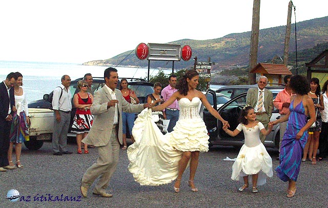 A kocsinkhoz visszakapaszkodva (szombat lévén) egy görög lakodalom szertartásába csöppentünk bele. Most vettük csak észre, hogy ahol parkoltunk, az a hely egy étteremmel szemben van. Az ifjú pár és a násznép épp akkor értek oda. A menyasszony (aki egyébként nagyon csinos volt) a parkolóban búcsú táncot járt a rokonaival. A végén a hitvesével is lejtett (legalábbis mi így értelmeztük) természetesen görög népzenére, bár nem népviseletbe öltözve.