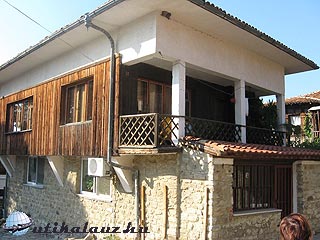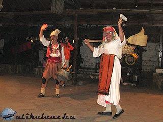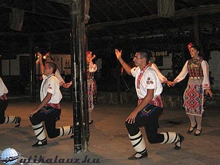 A busszal kb. 20 perc múlva érkeztünk Bata községbe, ahol a szórakoztató est folyt. Egy nagy udvarházban köszöntöttek bennünket az ajtónál kenyérrel és sóval, beljebb egy pohárka rakijával. Kicsit körülnéztünk az udvari árusoknál, majd bevonultunk az előre kijelölt asztalokhoz egy fedett „hodályba”, 14-en (kicsit szűken) egy asztalsornál. Középen a tánc- és bemutató hely, 3 hordóval, vörös és  fehérborral töltve. Olyan „kocsisbor” volt, nem ízlett a társaságnak. Volt, aki a fizetős büféből hozott innivalót. Egy tipikus bolgár kinézetű pincér hozta a vacsorát, az asztal felső végénél tálalt, és adtuk tovább a tányérokat. A menü: bab-csorba (bableves) pitével, salátával, majd a főétel saslik és sült hús krumplikörettel. Közben a zenekar popzenét játszott.