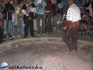 Háromnegyed 10-kor kimentünk az udvarra, ahol egy téglafalú körben parázstáncot járt dudaszóra egy mezítlábas ember. Az előre elkészített égő hasábokat szétterítette a körben, majd elkezdte a táncot, sőt,  a nézőközönségből is választott leányokat, gyerekeket, akiket beemelt a parázs fölé… A negyedórás produkció után bent folytatódott az össztánc. Volt nemzetek tánca is,  a magyarok egy  Republic számmal szerepeltek.