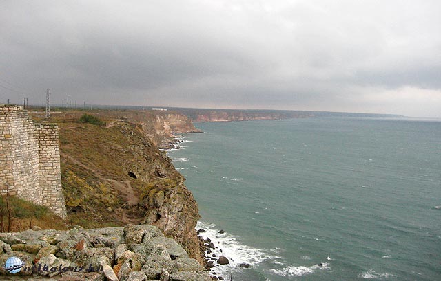 Kaliakra fok 40 lány emlékoszlop12,30-kor indultunk, 13 órára értünk a Kaliakra fokhoz. Szép természeti látványosság,  bizánci, török, bolgár történelmi események színhelye. Itt áll egy függőleges oszlopként a 40 lány emlékszobra. Eredete: a lányok  nem akartak a törökök kívánságára áttérni a muszlim vallásra, ezért hajukat összefonva a tengerbe vetették magukat a sziklákról. A félsziget stratégiai fontosságú volt a történelem során, minden hajót nyomon lehetett követni a szirtekről. Három  kaszt élt itt: az alsóbb rendűek a külterületen, a középosztályhoz tartozó kereskedők kisebb rangú papok a külvárosban, a gazdagokés fő tisztségviselők a várfalon belül laktak. Itt várfalon belül egy régi templomrom is látszik. Egy órát tartózkodtunk itt, lenéztünk a magas sziklafalakról a tengerre, majd a továbbra is zuhogó jeges esőben visszamentünk a buszhoz továbbindulásra.