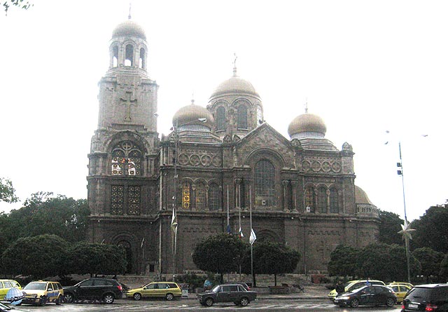 16,30-kor indultunk tovább. A legközelebbi falu neve: Vinyica volt. Az eső változatlanul esett… 17 órára értünk Várnába, a nagy tengerparti városba. Nem sok időt tudtunk itt tölteni. Először a Szűz Mária mennybemenetele templomot néztük meg, a szokásos ikonosztázzal. Utána kis városnézésre indultunk az esőben: egy aluljárón átmenve jutottunk a főtérre. Itt látható egy óratorony, a színház épülete, és egy sétálóutca kezdődik. Tekintettel az esős időre, tovább nem mentünk, betértünk egy pizza étterembe. Alig foglaltunk helyet, a csoport háromnegyede is beözönlött a szűkös helyiségbe!  Így egy kicsit hosszasabb volt a rendelés, persze mi hamarabb megkaptuk a hatalmas adagot. (Calcome, gombás sonkás, paradicsomos pizza, sörrel 22 L)