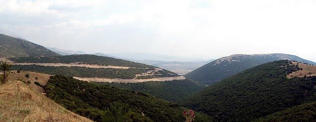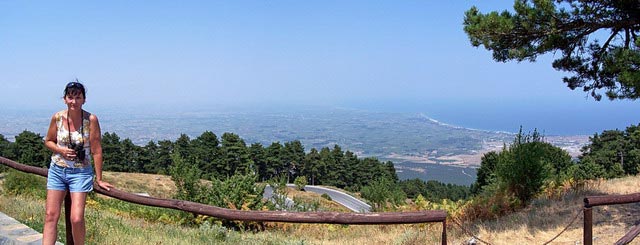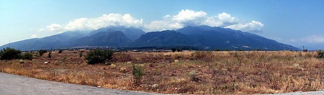 Készültünk rá sok térképpel (Olympos, Litohoro), amelyeket sikerült beszerezni az internetről, sőt rendeltünk Görögországból is igen részleteset is (itthon ilyet nem lehet kapni). Ezek mind nagyon hasznosak voltak. Észak felöl érkezve (Katerini közeléből) nem kell fizetni az autópálya használatért, mert idáig még nincs újabb kapu. Miután letérünk Litohoronál az autópályáról, érdemes megállni az első benzinkút környékén és készíteni néhány képet, esetleg panorámafotót. Júliusban már régen kiégett a fű és sárga előteret ad (Bizony ezek a képek teljes magasságú képként mutatnak jól a képernyőn).
