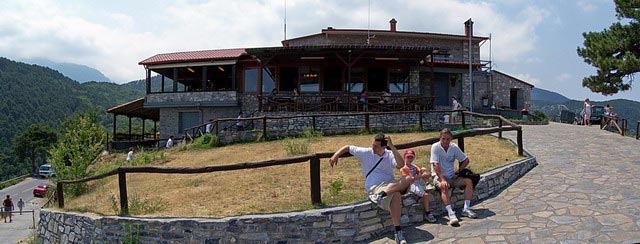 Litohoroban szépen ki van táblázva az útirány felfelé. A szerpentin elején, az út mellett, egy kis háznál, egy ember integet, hogy álljunk meg. Statisztikai adatokat gyűjt. Hányan mennek, milyen nemzetiségűek? És felhívja a figyelmet, hogy nem szabad dohányozni sem. A kérdezgetés nagyon kedves és jó kedvű hangulatban zajlott.