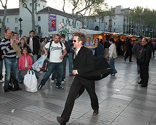 | Élő szobor – Rohanó yuppi, megmerevedve –a Ramblas-n | Mobil szobrok a Ramblas-n. Nem engedui, hogy fotózzam, ha nem fizetek… |