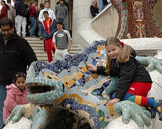 | A Güell-park, eső után. Távol a tenger! | A Güell imádott csempe-gyíkja |