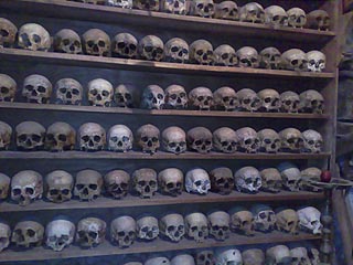 A metamorfoszisz szó magyarul az Úr színeváltozását jelenti, a kolostor régi neve „Széles kő” volt. 1. lakója Szent Athanásziosz (a Meteorita 🙂 … nagyon hangzatos ez a szó!) a XIV. sz.-ban keresztelte át. 613 m magasan van az épület, 146 sziklába vájt lépcső vezet fel hozzá. (Csak 1923-tól vannak lépcsők! Korábban hágcsóval és hálóval /= vrizoni-val/ közlekedtek. Fél óráig tartott 1-1 felhúzás.) A főtemplomban gyönyörű freskókat láttunk, bár számomra eléggé horrorisztikusak… (főleg a szentek igen kreatív és sokféle kivégzéseit mutatják be.) A templom csillárjai, mécsestartói, a faragott, intarziás szószékek és imakönyv tartók szintén csodálatosak. A másik, ami nekem nagyon tetszett, a koponyák terme (…szobája) Érdekes látvány a polcokra helyezett több száz koponya…