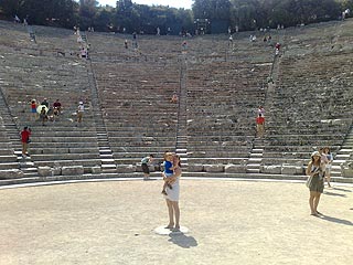 (Epidavrosz)-ba mentünk, ahol a „város szélén” megnéztünk egy kicsiny, XVI. sz.-i templomot – tárva-nyitva volt és nagyon tetszett – majd a színház felé vettük az irányt. Epidaurosz az ókorban gyógyüdülőként funkcionált. A papok imádkoztak Aszklépioszhoz és kultikus szertartásokat végeztek – sőt, operáltak is itt! – a betegek meg gyógyultak és szórakoztak. Ez utóbbi célt szolgálta a kimondottan jó állapotban megmaradt színház. I.e. IV. sz.-ban épült, 55 széksora van, melyen kb. 12000 ember fér el. Akusztikája olyan, hogy a leejtett pénzdarab csörgését és a gyufa sercenését is meg lehet hallani még a legfelső sorban is. Ezenkívül megnéztük a múzeumot – felejthető – és az ásatásokat is. Több épület romjait tárták fel, pl. a katagiont, ami kétemeletes épület volt, 160 helyiséggel, valószínűleg szállóként működött; a gimnasziont, ami a birkózóversenyek színtere volt; Aszklépiosz szentélyét… A szentély egész területén – pl. a múzeum oldalfalán – gyógyforrások találhatók. (Belépő 6 Euro/fő)