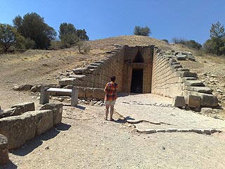 Az ásatásokhoz vezető úton először Átreusz kincsesházát néztük meg, ami egy sír az i.e. XIII. sz.-ból. Olyan, mint egy nagy méhkas belülről… (a valódi sír egy kis oldalkamrában volt.) A kincsesház 13,5 m magas, átmérője 14,5 m, a bejárati kapu 5,4 m-es, az odavezető út 36 m – eléggé monumentális. Ezután felmentünk a fő ásatáshoz. A bejárat után a híres oroszlános kapu látható, le is fotóztam, 4 tonnás kőtömbből áll. Majd megmásztuk a hegyet, a királyi palota csomó maradványát megtekintve, köztük a titkos lépcsőket is (99 db), melyek a citadella alatti ciszternákhoz vezetnek. Nem volt lezárva, lementünk. Igaz, csak kb. a 20. lépcsőig jutottunk, onnastól tök sötét volt… (tanulság: máskor legyen nálunk elemlámpa!) (1 belépő kell mindenhova – ezért a jegy megőrizendő! – 8 Euro/fő)