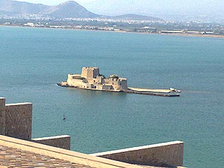 Nekem egyáltalán nem tűnik görögösnek, inkább olaszos… A kikötő nagy és büdös, a panoráma viszont fantasztikus! Közvetlen a part előtt egy kis szigeten áll a Burtszi (Burdzi)- erőd, a velenceiek építették a XVII. sz.-ban. 1930-ig itt dolgozott a helyi hóhér. Az erődítmény fő feladata az volt, hogy egy lánc segítségével éjszakára lezárja a kikötőt (a láncot az erőd és a part között feszítették ki.) A másik, amit megnéztünk, a Palamidi vár volt. 220 m magas hegyen áll, a XVIII. sz.-ból származik, szintén velencei. 2 módon közelíthető meg: a rövidebb, de nehezebb út 850 (mások szerint 999) tükörsimára koptatott kőlépcső, ami úgy csúszik mint a rosszseb; a hosszabb, de egyszerűbb egy 3 km-es aszfaltozott autóút. Az erőd Homérosz Palamédész nevű hőséről kapta a nevét, 7 tornya van, hatalmas. És ami nagyon tetszik, hogy szinte végig bejárható. Igaz, romos – néhol életveszélyes a korlát(ok) hiánya miatt – de érdekes és a panoráma is csodás. Sok-sok kisebb-nagyobb járatot láttunk a termekben, gyakran félig befalazva, amik ki tudja hova vezetnek…