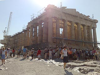 A felvezető lépcsőket a sokezer turista életveszélyesen simává koptatta, ezért én inkább a fém lépcsőzetet választottam. A kilátás odafenn tökéletes, mindent végig lehet szemlélni a városban. Tovább folytatva az utat a valódi főbejárathoz értünk (belépő 12 Euro/fő), áthaladtunk a Propülaián – i.e. V. sz.-ban épült monumentális, oszlopos bejárat, mellette a kis Niké templommal -, elsétáltunk a Parthenonhoz – tető nélkül is csodálatos… Pallasz Athéne templomát a tökéletes szimmetria (9:14 arány) jellemzi -, láttuk az Erektheiont – itt vannak a kórák (nő alakú oszlopok), régen az összes többi isten szobra itt volt – és gondolkodtunk az Akropolisz múzeumon, de ez utóbbit nem néztük meg, százezren álltak sorban előtte. Felhívtuk Esztit, anyósomat, kifogástalan volt a térerő. Egyébként az egész Akropolisszal meg voltam elégedve… Sok a segítő személyzet, rendőr, tisztaság van, még a WC is szép.