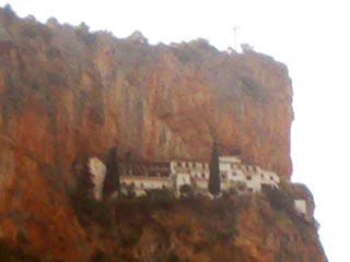 Hát… a tenger se volt kutya, de ezek a hegyek! Keskeny, sokszor korlát nélküli utakon haladtunk a hatalmas szakadékok felett. Bár csodálatos a táj, mégis ijesztő. Zoli kb. 30-40 km/h-val vezetett, de még így is veszélyesnek tűnt. Ahogy kanyarogtunk felfelé, az egyik függőleges szikla oldalában – több száz méter magasan – feltűnt egy kis kolostor. Hihetetlen látvány! Mintha odaragasztották volna…