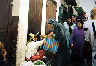 Elvezettek (jobban mondva tereltek) minket egy fűszer-gyógynövény boltba. Itt körbe-körbe padok voltak, helyet foglaltunk, és végignéztünk (ill. szagoltunk) egy fűszer-gyógynövény bemutatót. Természetesen Zsuzsa tolmácsolt, és a végén vásárolni is lehetett (spanyol pesetáért). Vettünk egy csomag jó erős, igazi marokkói mentateát.