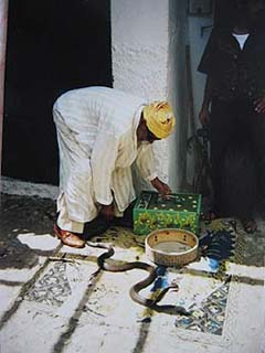 Nemsokára következett egy igazi meglepetés. Körbeálltunk egy bácsikát, aki egy doboz mellett állt. Mikor mindenki ott volt, kinyitotta a dobozt, abból pedig kibújt egy kígyó. Ebben a pillanatban mindenki felhördült, és egy lépést hátra lépett. Ez egy kobra volt, amit mutogatás után visszarakott a dobozba, és kivett egy másik fajtát, a szelídebb fajtából. Ez egy szép, méretes kígyó volt, ezt a nyakába vehette, aki akarta. Kínálta a bácsi nekünk is, de kösz, nem kértünk belőle. Leginkább a gyerekekre próbálta rárakni, szegény kölykök nem győztek menekülni előle. Utána kihagyhatatlanul körbekalapozott a bácsi, mindenki bedobta a részvételi díjat. Miután megindult a csoport, a bácsi csinált gyorsan még egy kört, de már nem dobott senki ráadást. Erre engem vett célba, és kezdett veszekedni, hogy én adjak még, illetve a gyerekre mutogatott, hogy ő is fizessen. Ezt eljátszotta a többi gyerekes szülőnél is.