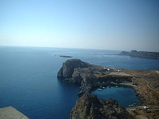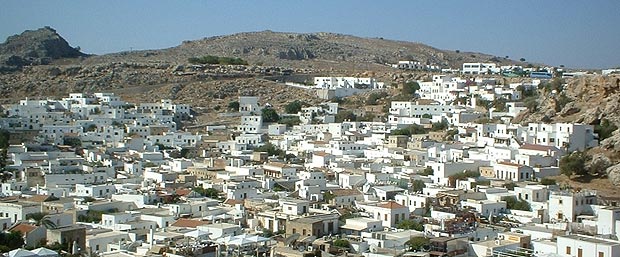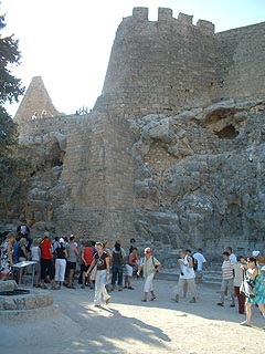 Mindez csábítóan hangzik, rászánjuk a keddi napot, és korán kelünk. Legtávolabb Lyndos található az úti programban, ezért először ide látogatunk. Az ötven kilométeres buszos utazás alatt szép és érdekes történeteket hallgatunk az idegenvezetőtől, de a látvány, ami Lyndos közelében fogad minket, felülmúlhatatlan. A tengerparti öbölből a buszunk felvisz minket a hegyi parkolóig, innen gyalogosan, vagy szamárháton mehetünk fel, egészen az Akropoliszig. A csacsik kettesével összefogva mennek a vezetővel, a hátukon ülő turistákat egykedvű megadással himbálják a „csacsi ösvény” kövein, mi inkább a saját lábainkra bízzuk e nemes feladatot. Bár a számos szűk kis utcácska rengeteg kísértésnek tesz ki minket szebbnél-szebb portékáival, csipkéivel, dísztárgyaival, azért szerencsésen felérkezünk az Akropolisz aljába.